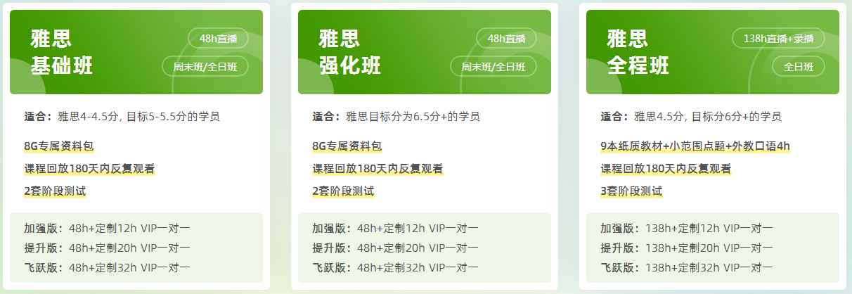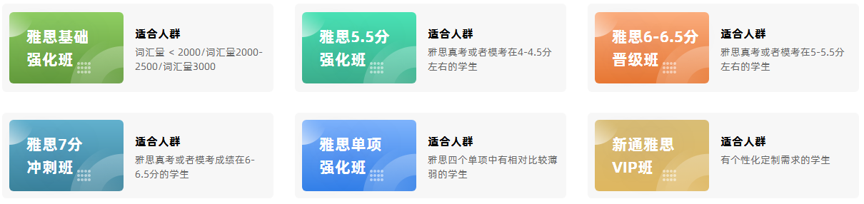 2. 0基础到7分,多种班型,给你更多雅思学习选择 雅思基础班/5.5分班/6-6.5分班/7分班:0基础到7分,新通雅思课程满足所需 面授/网课/集训班:面对面讲解更直观,问题及时解决;时间自由,直播/回放,学习更方便;突击强化训练,短时间内急速提高。 大班/小班/VIP班:建立良好竞争,方便经验交流;更多展示锻炼机会,针对性强;一对一服务,满足所需。 全日班/晚班/周末班:助于养成良好学习习惯,稳步提升;合理利用时间,灵活自由;平衡工作生活,互不影响,集中提高。  |